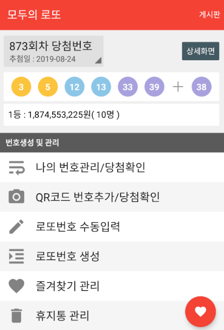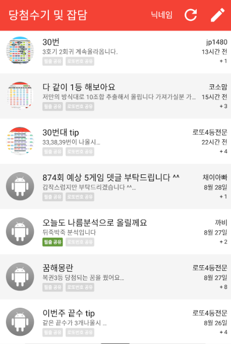 1. 로또 앱을 만든지도 아주 오래된 것 같습니다. 세월이 흘러 지속적인 사용자들도 많이 늘어났고 그에 따라 게시판도 활성화가 조금 되었네요. 많은 분들이 로또 번호도 공유하며 당첨내역도 공유하고 재밌게 이야기 나누십니다. 로또에 관심 있으시면 한번 놀러 오세요.