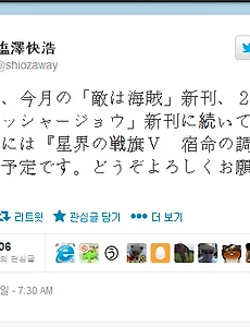 전체 글630 [안드로이드] 현재 앱의 버전코드와 앱내에서 구글마켓 업데이트 화면 가기 - AndroidManifest.xml 에 있는 versionCode와 versionName 를 소스에서 불러오기 PackageManager packageManager = mContext.getPackageManager(); // PackageInfo infor = packageManager.getPackageInfo(mContext.getPackageName(), 0); PackageInfo infor = packageManager.getPackageInfo(mContext.getPackageName(), PackageManager.GET_META_DATA); version = infor.versionName; code = infor.versionCode; - 앱내에서 구글마켓 업데이트 화면 이동시키기.. 2013. 4. 1. [안드로이드] drawable의 리소스를 변수로 가져와 보자 일반적으로 R.drawable.XX 형태로 많이 가져올것이다. 이것을 변수형태로 for문이나 또는 웹에서 받아온 번호의 이미지를 리소스에서 읽어오려면 아래와 같이 하자.http://www.androidpub.com/index.php?_filter=search&mid=android_dev_qna&search_target=title&search_keyword=drawable&document_srl=2305093펌 : http://www.androes.com/96R.drawable내 이미지를 일일히 배열로 지정해서 매칭하는 방법외 가변 변수로 다이나믹하게 지정하는 방법을 소개해 드릴까 합니다.예를 들면 R.drawable.n_1, R.drawable.n_2, R.drawable.n_3 ....R.drawabl.. 2013. 3. 28. [애니] 충사(蟲師) 이번에 감상한 작품은 蟲師(충사) 라는 작품이다. 처음에 이 제목을 들었을 땐 왠지모르게 뱀이 나오는 애니메이션이 아닐까 했는데 한자를 보니 벌레와 관련이 있는 애니메이션이였다. 벌레라고 해도 우리가 흔히 말하는 벌레가 아닌 약간은 상상력이 동원된 미지의 세계에 있는 벌레들이랄까.. 인간의 상상력은 참으로 대단하다. 충사인 주인공 깅코의 여행을 그린 애니메이션 각 화마다 새로운 에피소드로 그려간다. 주인공과 관련된 이야기도 있고 그렇지 않은 이야기도 있다. 마무리가 오픈된 상태로 끝나 조금 아쉽지만 ... 어쨌든 작품 감상해보면 약간은 인생사에 대해서도 생각하게 해주는 작품인거 같다. 즐감!! 2013. 3. 23. [애니] xxxHolic 감상 클램프 원작의 xxxHolic란 작품을 보았습니다. 오~ 재미나네요. 한편, 또는 두편 정도의 길이로 에피소드가 나오는데요. 모든 에피소드가 어느정도 교훈을 주기도 하고 내용들이 좋은거 같습니다. 쭉 보다 보니 히마와리쨩에 대한 의문점이 좀 있기도 하지만 걍 그려려니 넘어가도록 합니다. 영능력자로 나오는 꼬맹이가 상당히 귀엽군요!! 2013. 3. 17. [애니] 블러드-C : 더 라스트 다크 아무런 정보도 없이 극장판 애니랍시고 보았다. 헉!!! 하지만 보고난 후 "이게 뭐지??" 란 생각을 하게 되었다. 뭔가 내용이 허무하게 끝나는것이 아닌가?? 그래서 검색을 해보니 극장판 전에 나온 TV판을 보지 않으면 내용이해가 잘 되지 않고 재미가 없을 수 밖에 없다는 것을 알게 되었다. 그렇다고 하더라도 뭐랄까... 극장용이라 한다면 내용이 이해가 약간 안되더라도 재미는 있어야 하지 않을까 결국 끝까지 보긴 했지만 뭔가 기승전결이 부족하지 않나 싶다. 분명 TV판이 있었으니 "결" 부분에 해당되는 극장판인데 이처럼 임팩트가 없는것은 좀 실망스럽다. 물론 TV판을 보지 않아서일 가능성이 아주 아주 높다. 여자 주인공인 "사야" 하나만 놓고 보면 꽤나 괜찮은 캐릭터를 만들어 낸듯 싶은데... 어쨌든 적.. 2013. 3. 6. [일드] 프라이스리스( Priceless ) 간만에 본 기무라타쿠야가 나오는 드라마... 전체적으로 재미있게 감상을 하였으나.. 마지막이 부분이 좀 허무함이 쬐금~ 있는거 같은 아쉬움이 있다. 기무라타쿠야도 나이를 많이 먹긴 했나보다 예전보다 많이 늙은 느낌이 들긴 든다. 그도 늙어 가는구나!! 뭐든 열심히 하는 자에게 성공과 복이 따른다고 했다. 사실 성공이라는 것은 열심히 했기 때문에 따라오는 것이기에 복이라고 할 수 없고 "열심히"란것에 따른 인과관계에서 오는것이 성공이라 할 수 있겠다. 뭐든 열심히 해보자 뭔가가 항상 따라올 것이다. 나는 열심히 했으나 아무것도 결과가 없다라고 한다면 너무 성급하게 생각한것이다. 미래에 언젠간 그 보답이 있을 것이다. 화이링!!!! 2013. 2. 25. [애니] 러브 콤플렉스 완결(총 24화) 이번에 감상한 작품은 러브 콤플렉스 입니다. 무려 6년전인 2007년에 방영된 작품입니다. 화면비율도 예전 비율이더군요. 요새 시간이 좀 남아 여러가지 작품들을 많이 보는데 간만에 좋은 작품을 본것 같습니다. 제 생각엔 원작이 약간은 순정쪽이나 여성유저를 위한 작품이 아닐까 생각이 되는데... 남자인 제가 봐도 재미있게 볼 수 있었던것 같습니다. 키가 큰 여성과 키가 작은 남성의 고등학교 사랑이야기 입니다. 더 이상 내용 이야긴 안하겠습니다. 꼭 감상하세요!!! 요새 나오는 팬티물들과는 격이 다릅니다 ^^; 2013. 2. 18. [안드로이드] 리스트뷰 끝까지 스크룰시 동적으로 내용 더 가져오는 방법 아래 3군데의 블로그를 참고 하면 쉽게 구현 할 수 있다. http://theeye.pe.kr/entry/Androidhttp://maydong.tistory.com/69http://croute.me/459 2013. 2. 14. [소설] 성계의 전기 5권이 3월에 일본에서 발매 되는군요. 해석은 : 그리고 이번달에 "적은 해적" 신간, 2월에 "크랏샤 조" 신간, 이어서 3월말에는 "성계의전기V - 숙명의 조율"가 발간 예정입니다. 잘 부탁합니다. ( 調べ는 조사, 수색 등의 뜻으로 일반적으로 쓰이는데 숙명을 조사 수색하는건 뭔가 이상한것 같네요. 사전을 보니 조